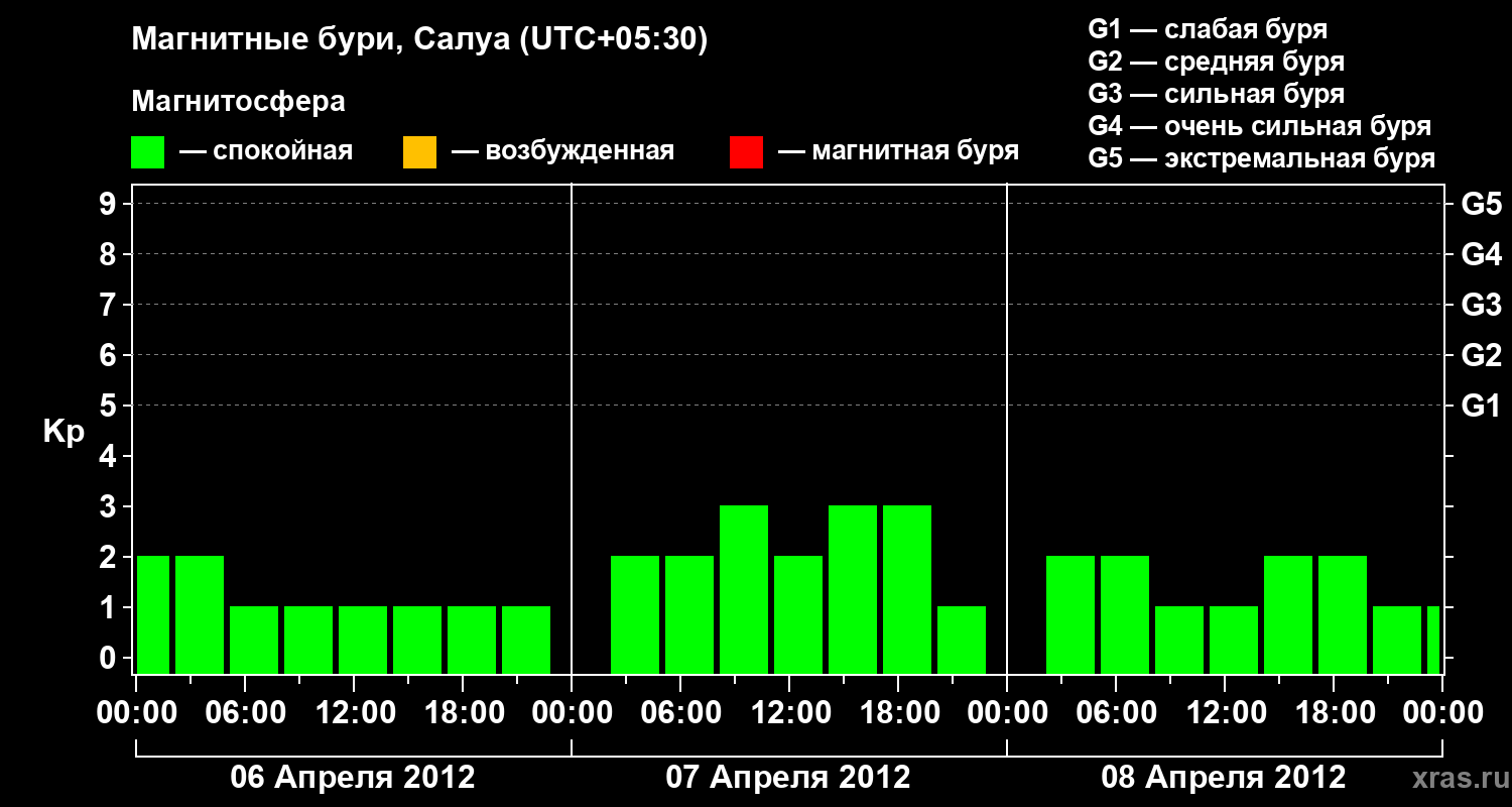 Изменения геомагнитного индекса Kp с 6 по 8 апреля 2012 года для средних широт