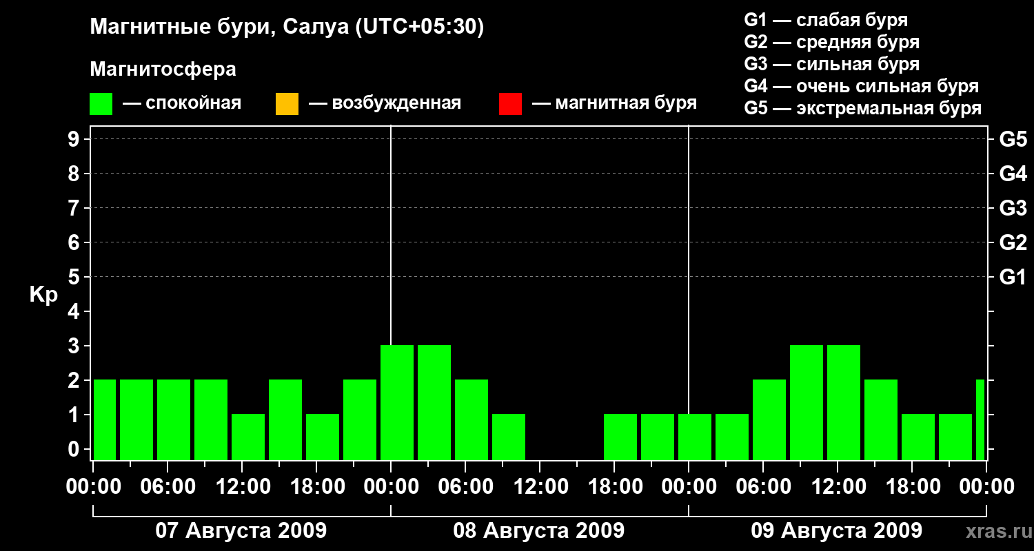 Изменения геомагнитного индекса Kp с 7 по 9 августа 2009 года для средних широт