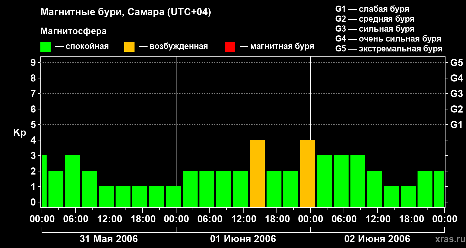 Изменения геомагнитного индекса Kp с 31 мая по 2 июня 2006 года для средних широт