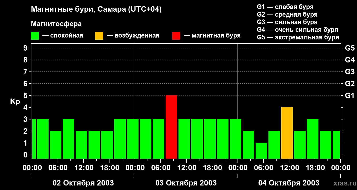 Изменения геомагнитного индекса Kp с 2 по 4 октября 2003 года для средних широт
