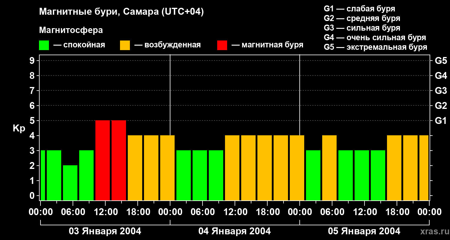 Изменения геомагнитного индекса Kp с 3 по 5 января 2004 года для средних широт