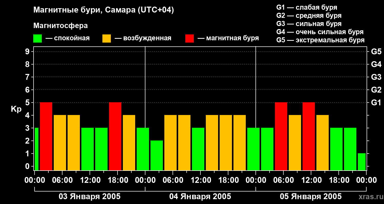 Изменения геомагнитного индекса Kp с 3 по 5 января 2005 года для средних широт