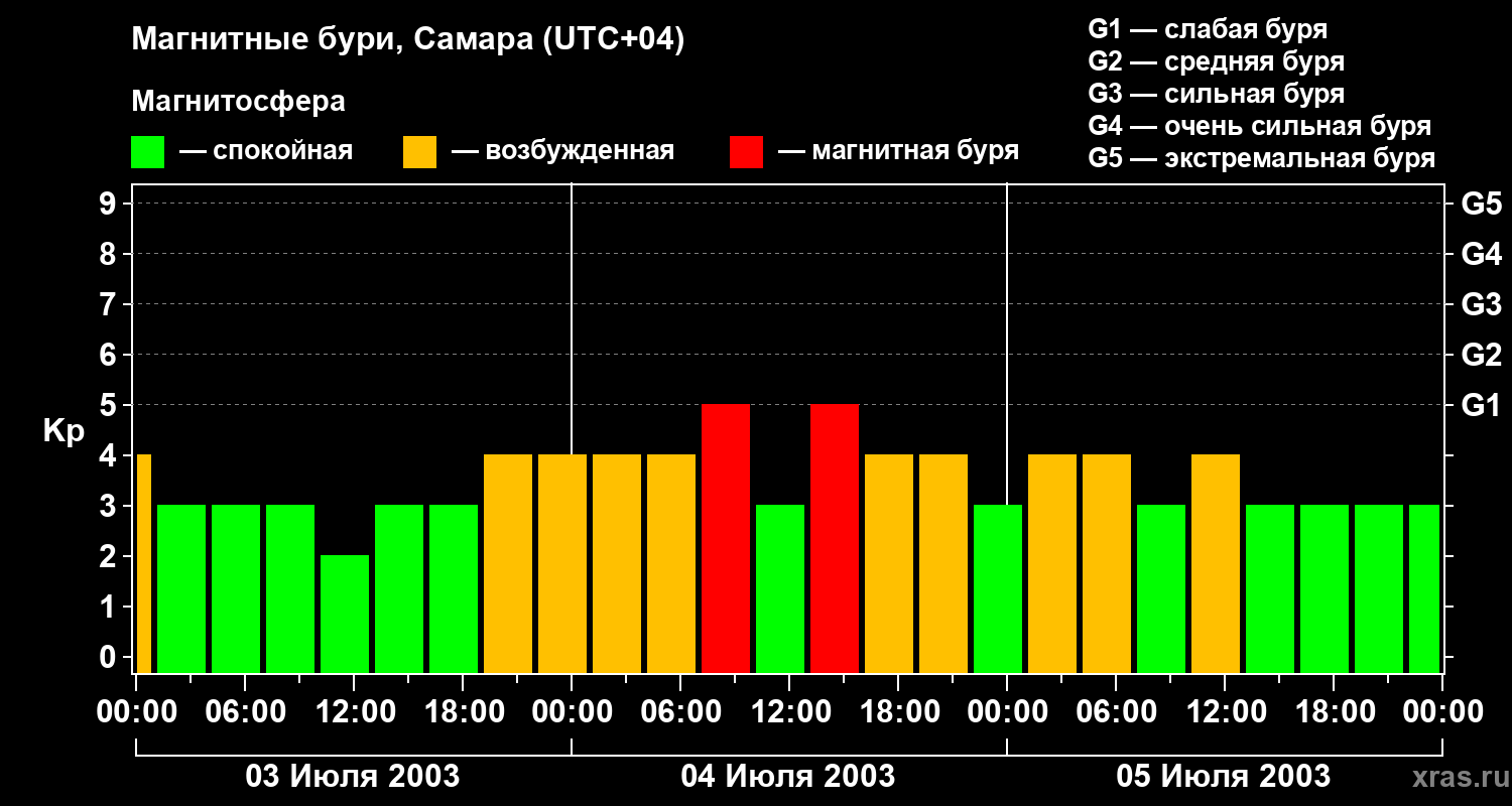 Изменения геомагнитного индекса Kp с 3 по 5 июля 2003 года для средних широт
