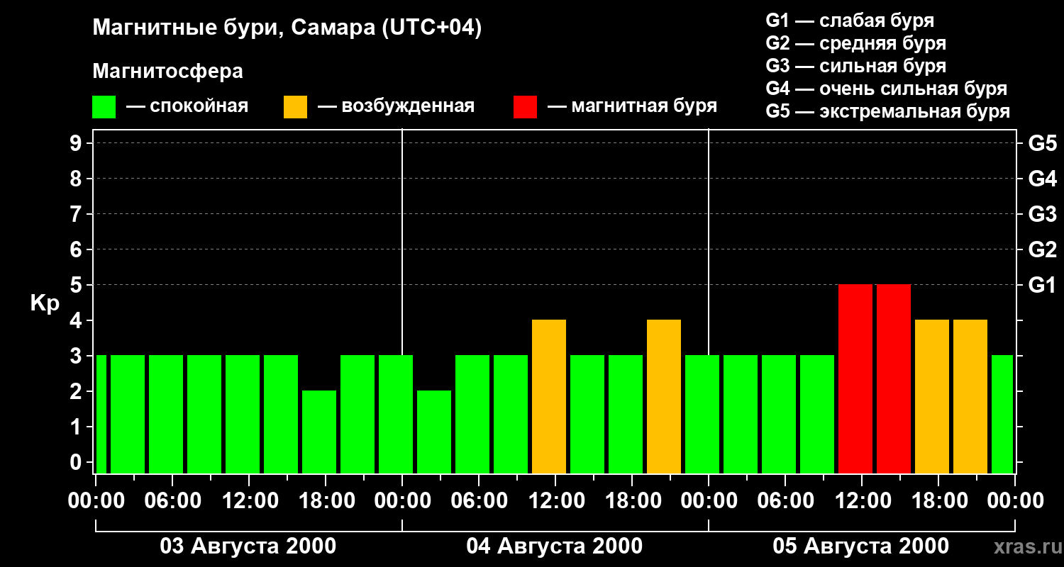 Изменения геомагнитного индекса Kp с 3 по 5 августа 2000 года для средних широт