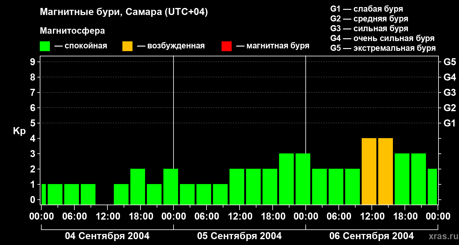 Изменения геомагнитного индекса Kp с 4 по 6 сентября 2004 года для средних широт