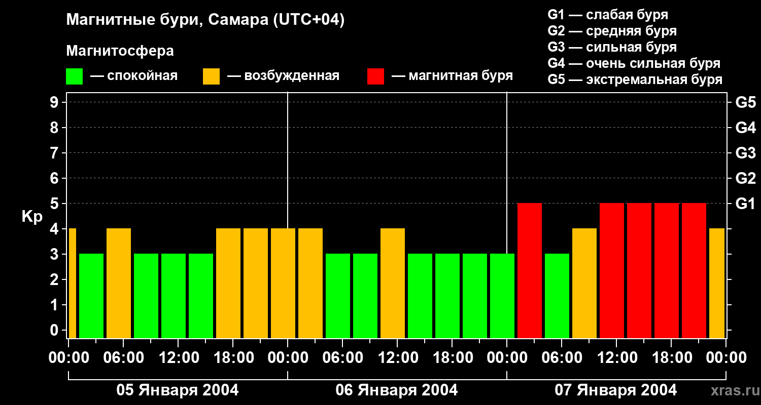 Изменения геомагнитного индекса Kp с 5 по 7 января 2004 года для средних широт