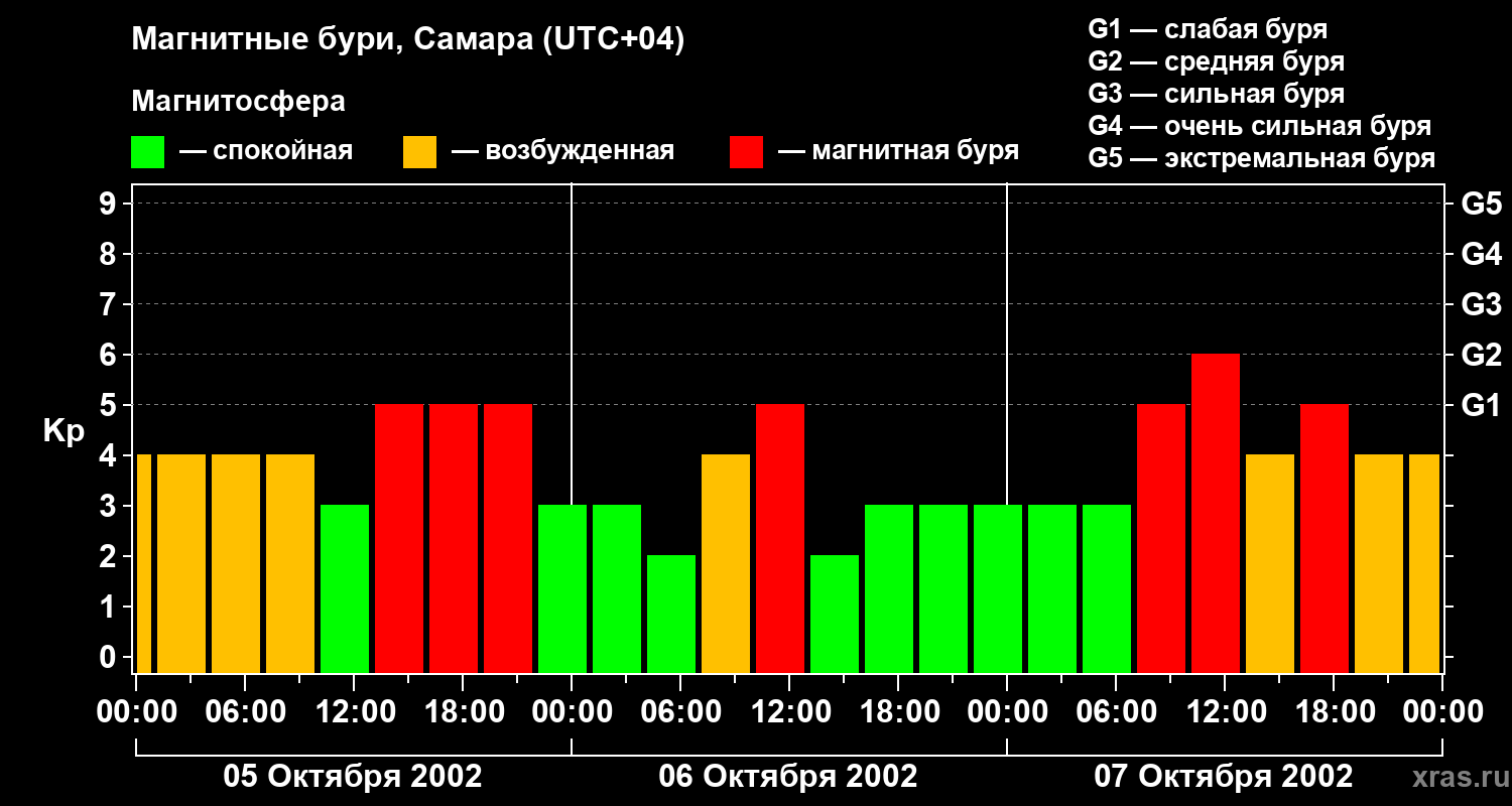 Изменения геомагнитного индекса Kp с 5 по 7 октября 2002 года для средних широт