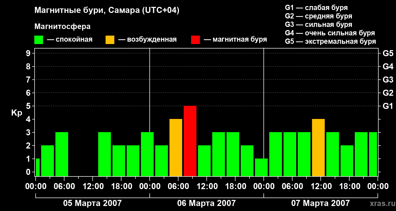 Изменения геомагнитного индекса Kp с 5 по 7 марта 2007 года для средних широт