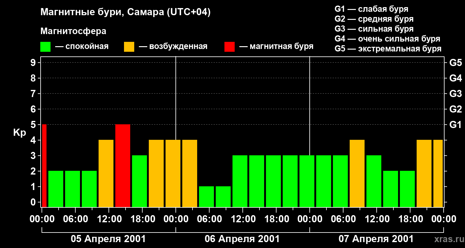 Изменения геомагнитного индекса Kp с 5 по 7 апреля 2001 года для средних широт