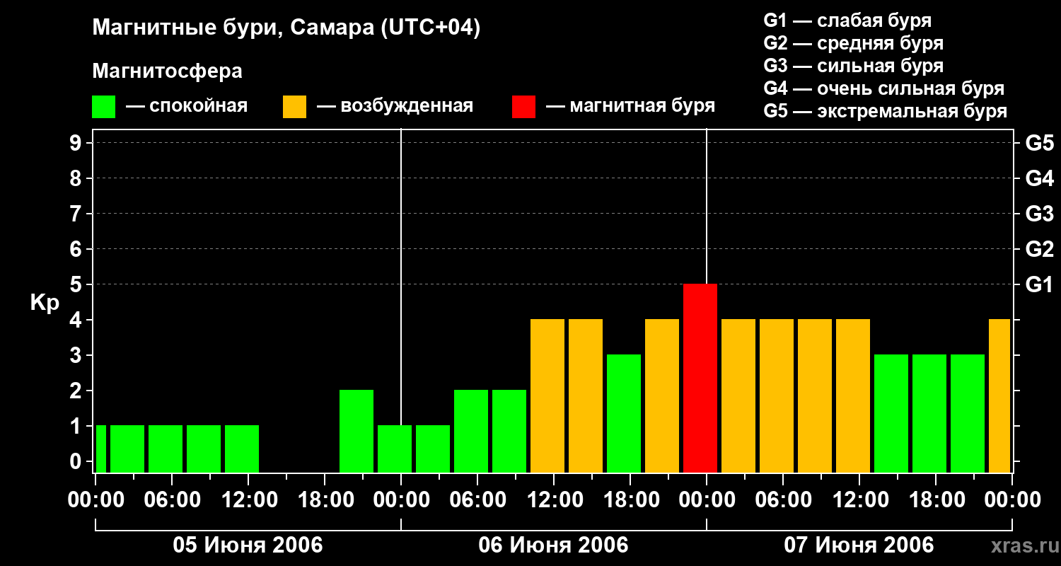 Изменения геомагнитного индекса Kp с 5 по 7 июня 2006 года для средних широт