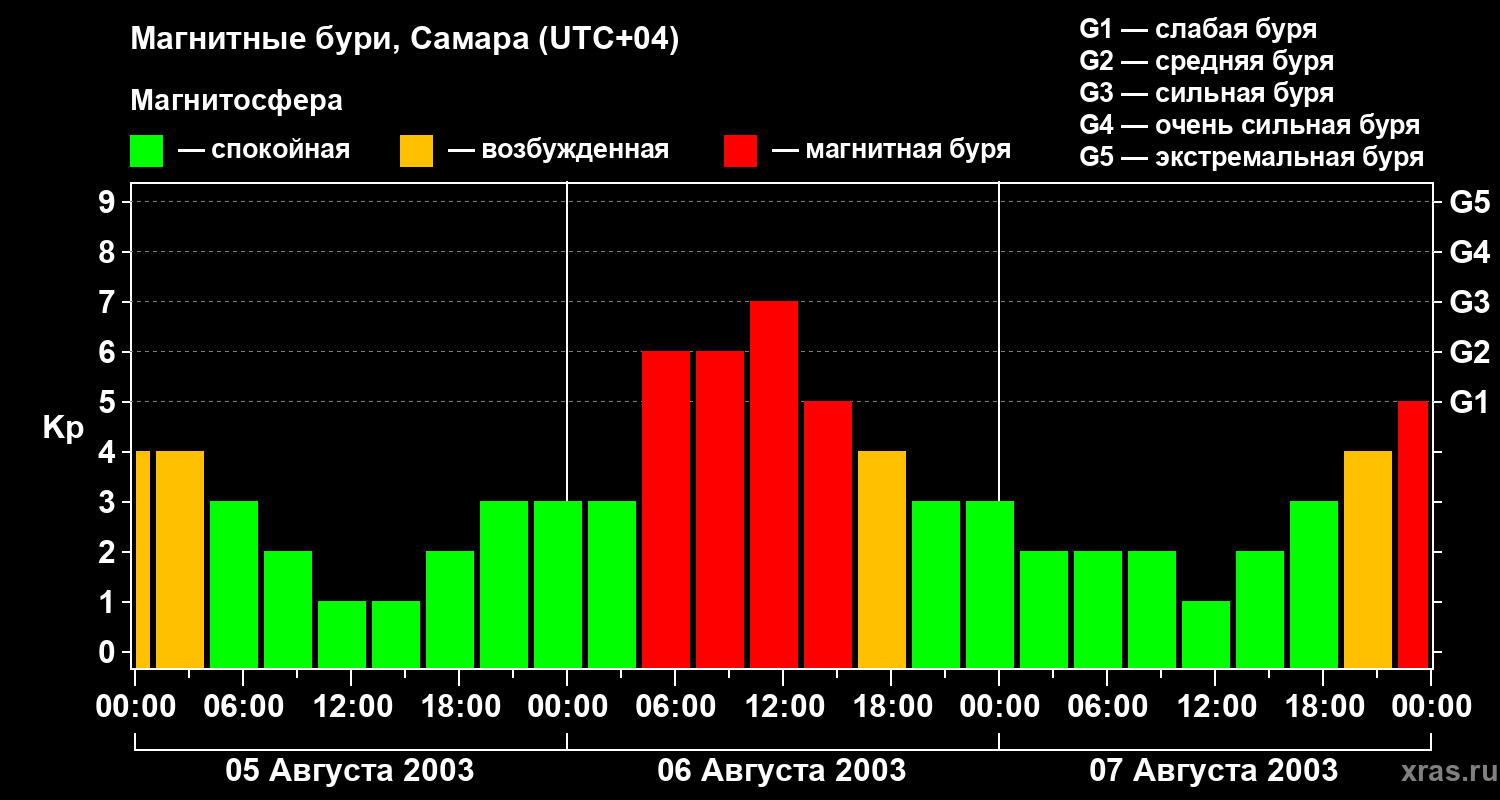 Изменения геомагнитного индекса Kp с 5 по 7 августа 2003 года для средних широт