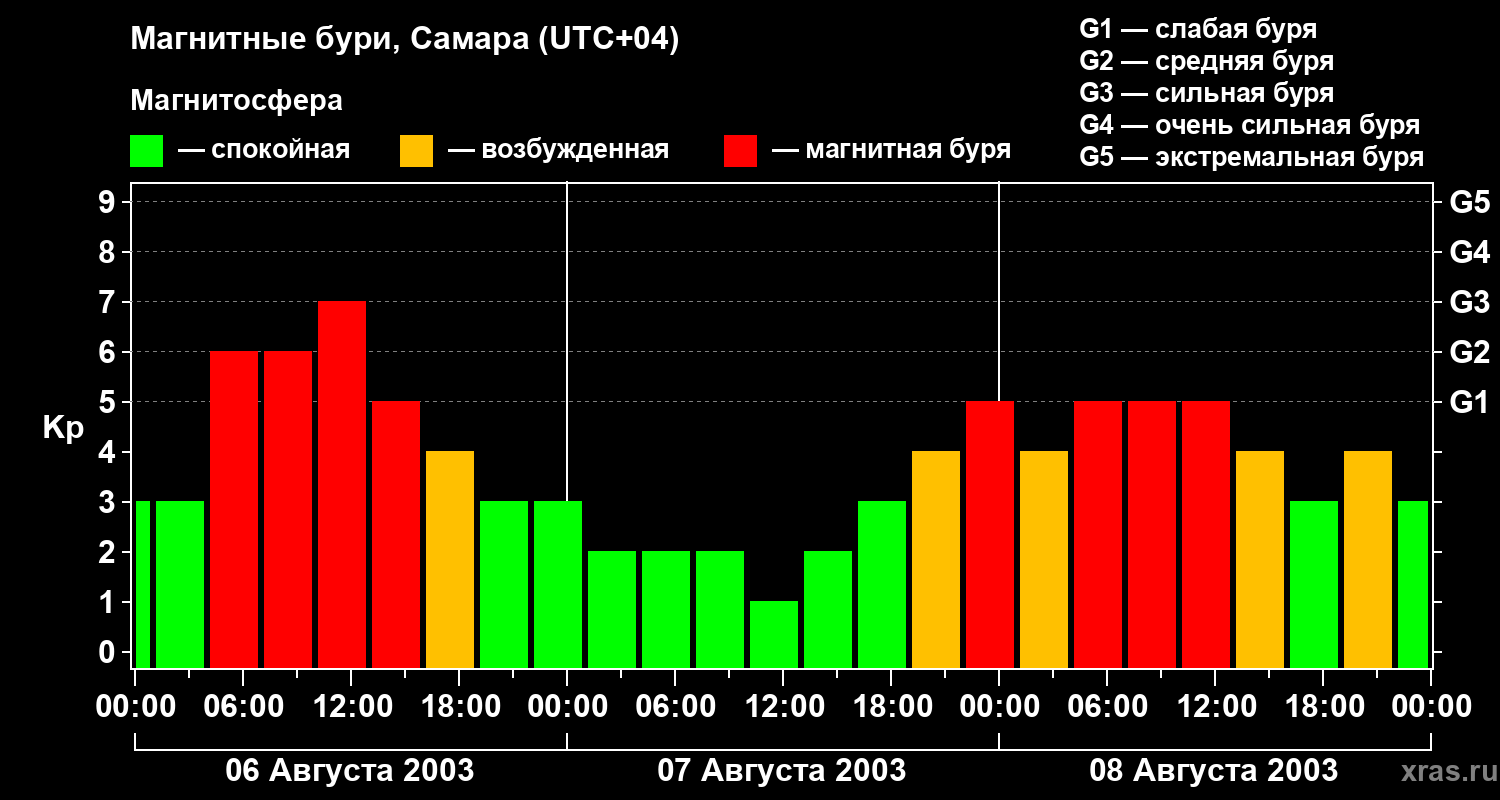 Изменения геомагнитного индекса Kp с 6 по 8 августа 2003 года для средних широт