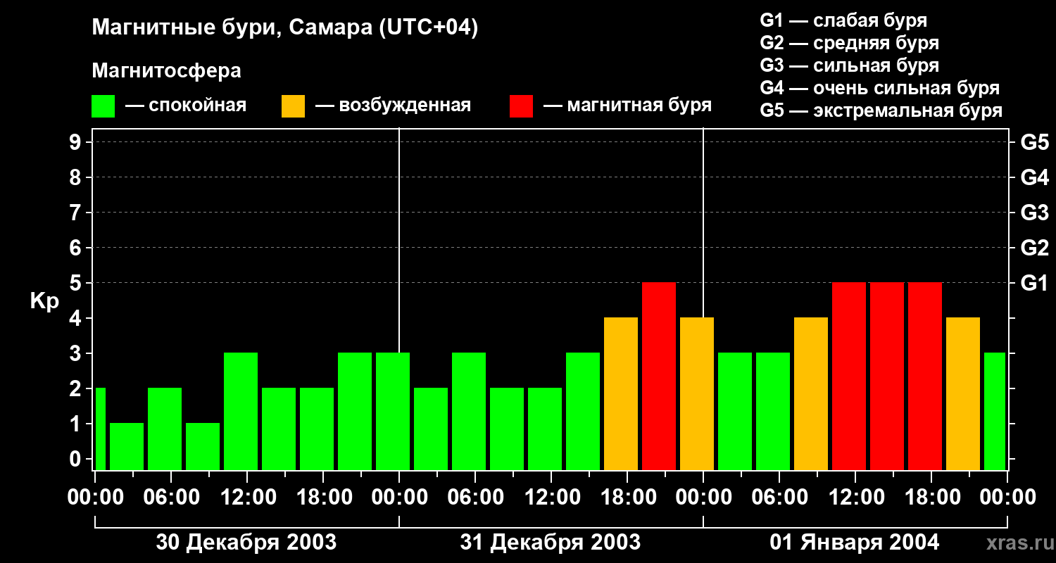 Изменения геомагнитного индекса Kp с 30 декабря 2003 года по 1 января 2004 года для средних широт