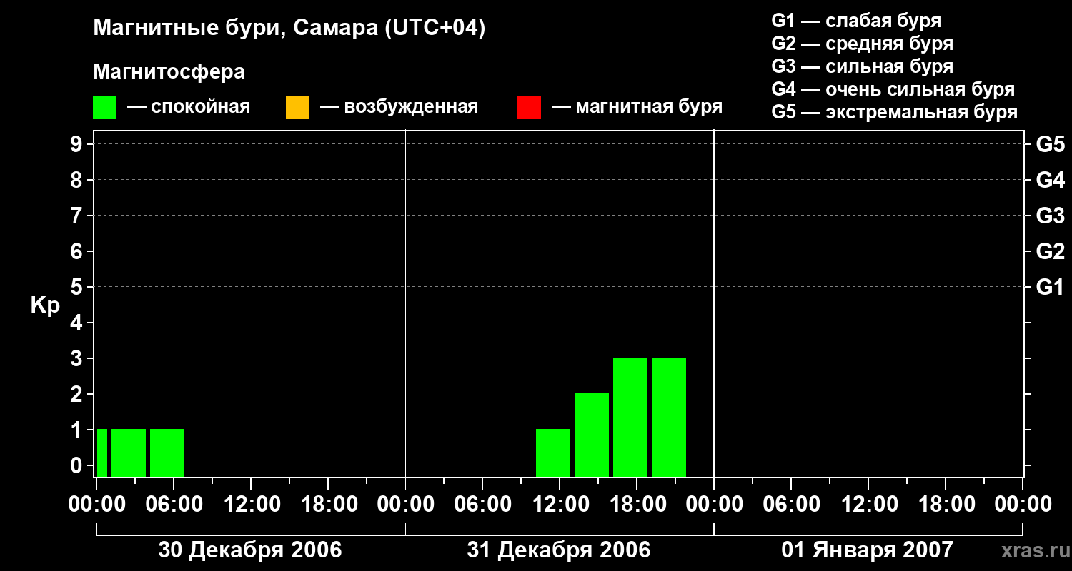 Изменения геомагнитного индекса Kp с 30 декабря 2006 года по 1 января 2007 года для средних широт