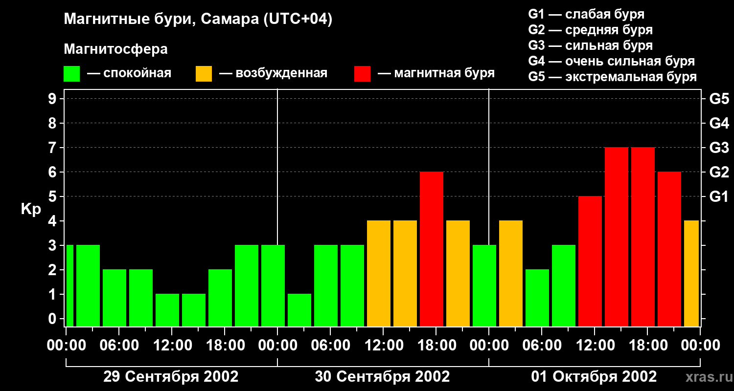 Изменения геомагнитного индекса Kp с 29 сентября по 1 октября 2002 года для средних широт