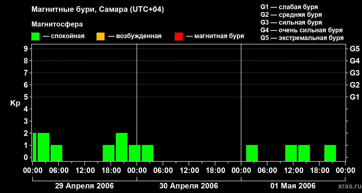 Изменения геомагнитного индекса Kp с 29 апреля по 1 мая 2006 года для средних широт