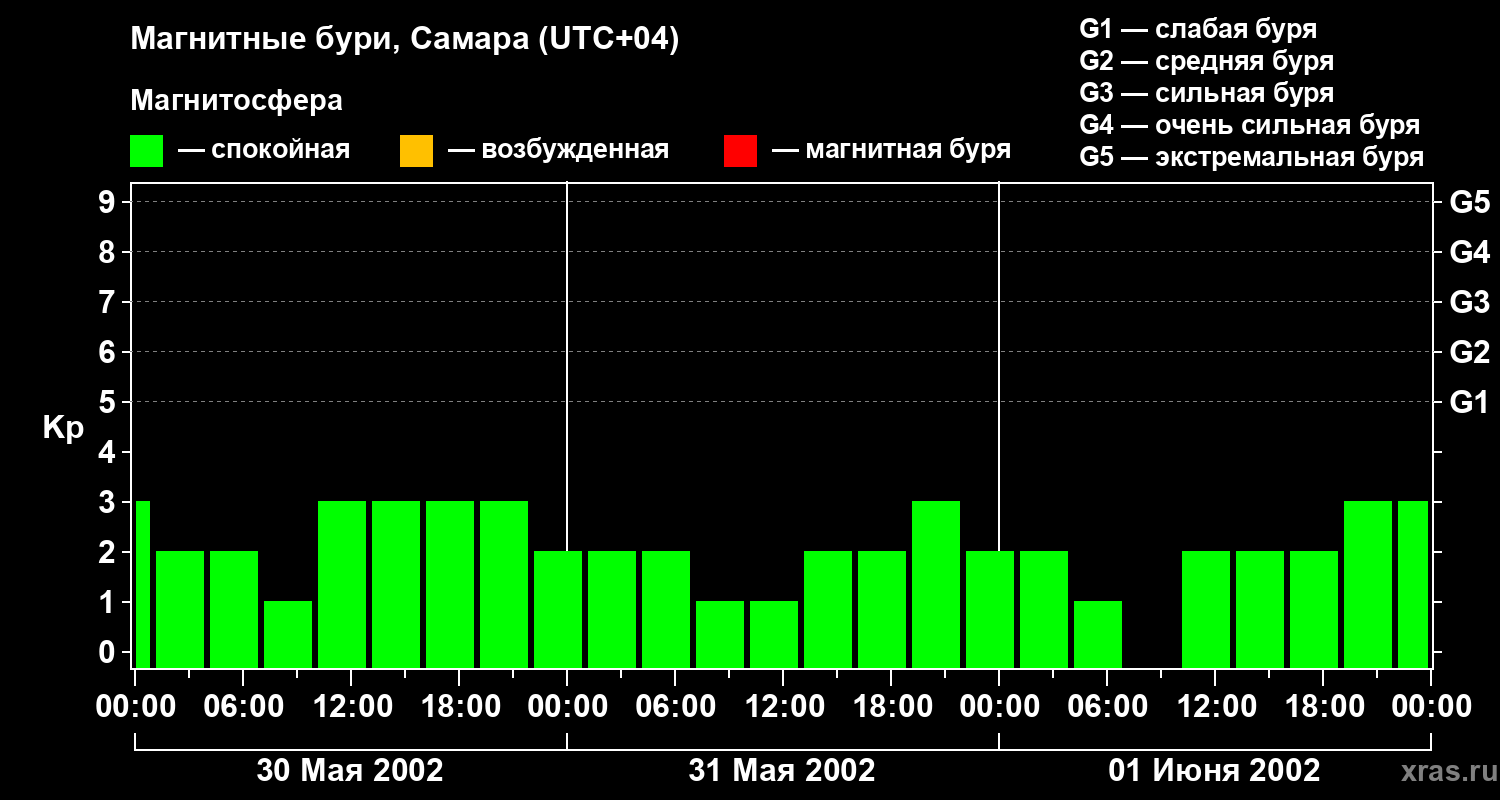 Изменения геомагнитного индекса Kp с 30 мая по 1 июня 2002 года для средних широт