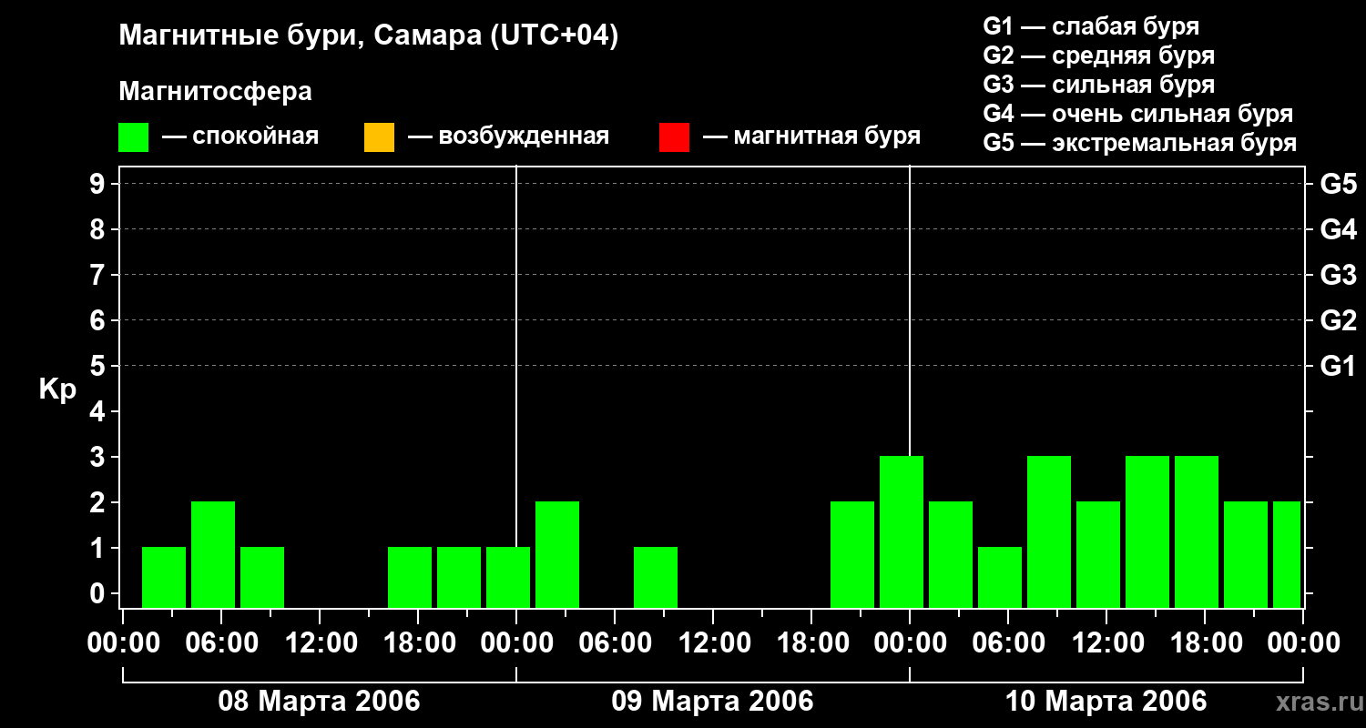 Изменения геомагнитного индекса Kp с 8 по 10 марта 2006 года для средних широт