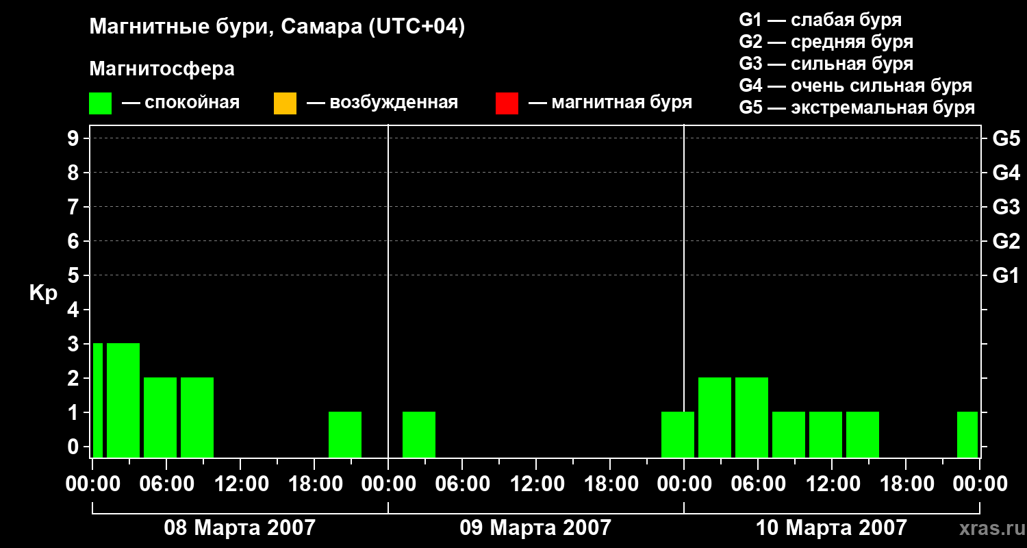 Изменения геомагнитного индекса Kp с 8 по 10 марта 2007 года для средних широт