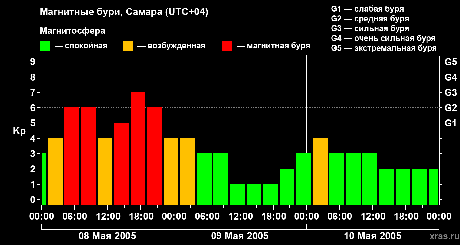 Изменения геомагнитного индекса Kp с 8 по 10 мая 2005 года для средних широт