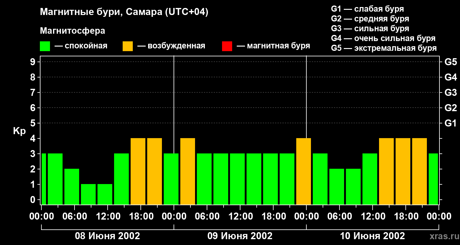 Изменения геомагнитного индекса Kp с 8 по 10 июня 2002 года для средних широт