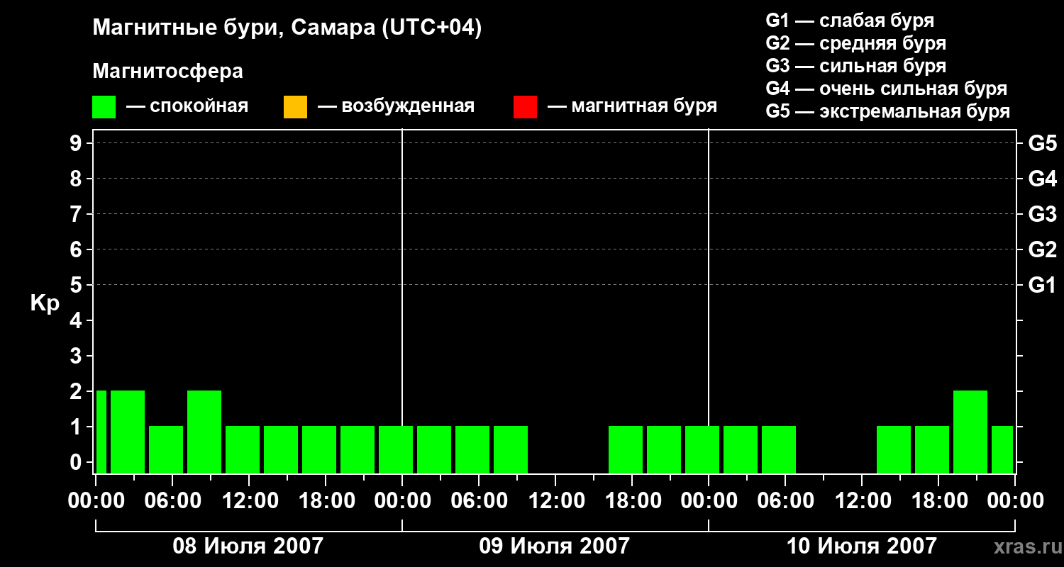 Изменения геомагнитного индекса Kp с 8 по 10 июля 2007 года для средних широт