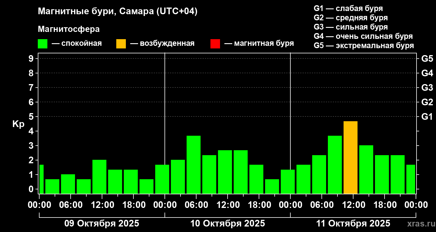 Изменения геомагнитного индекса Kp с 9 по 11 октября 2025 года для средних широт
