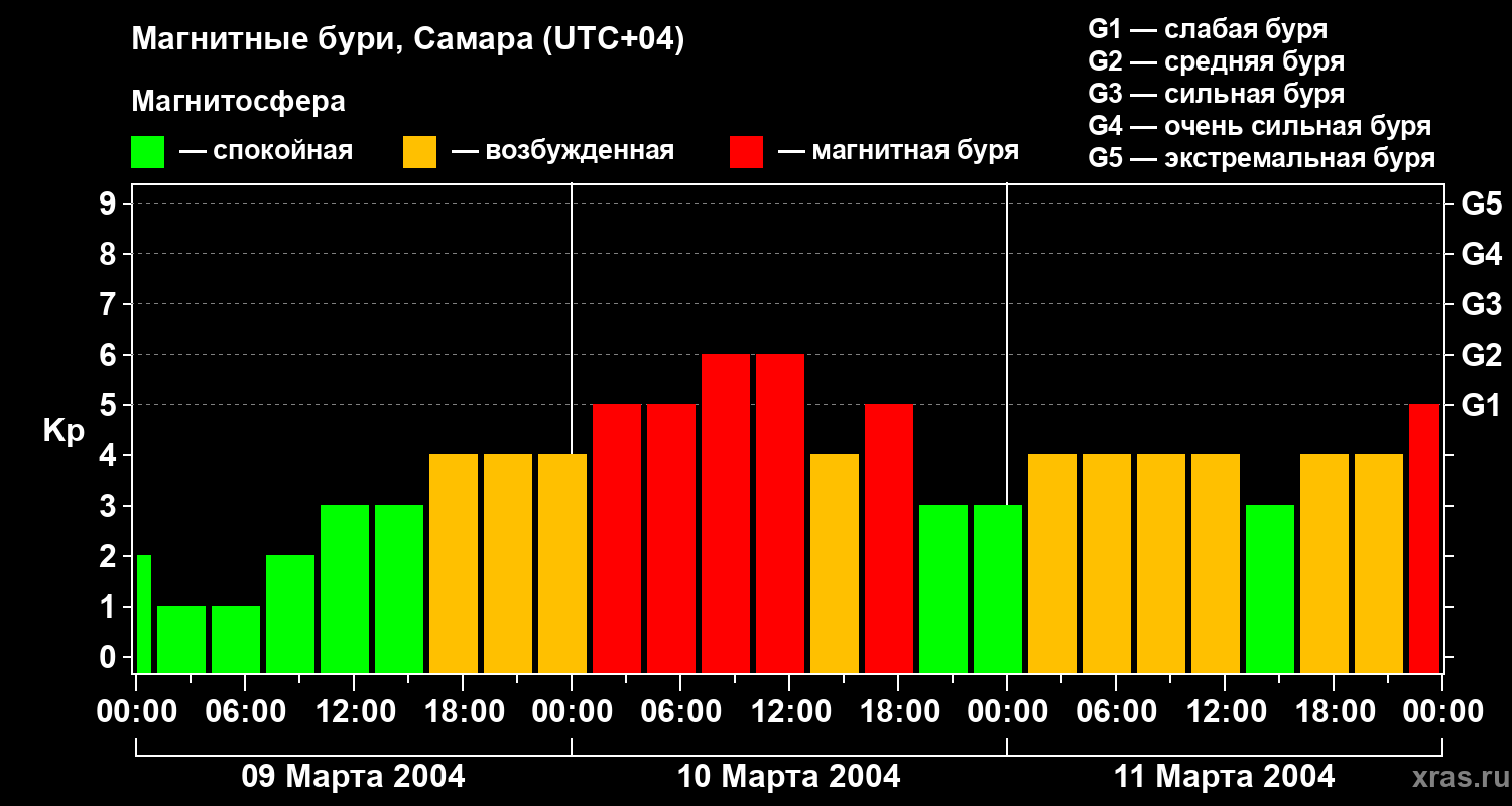 Изменения геомагнитного индекса Kp с 9 по 11 марта 2004 года для средних широт