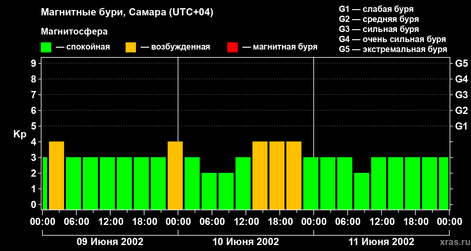 Изменения геомагнитного индекса Kp с 9 по 11 июня 2002 года для средних широт