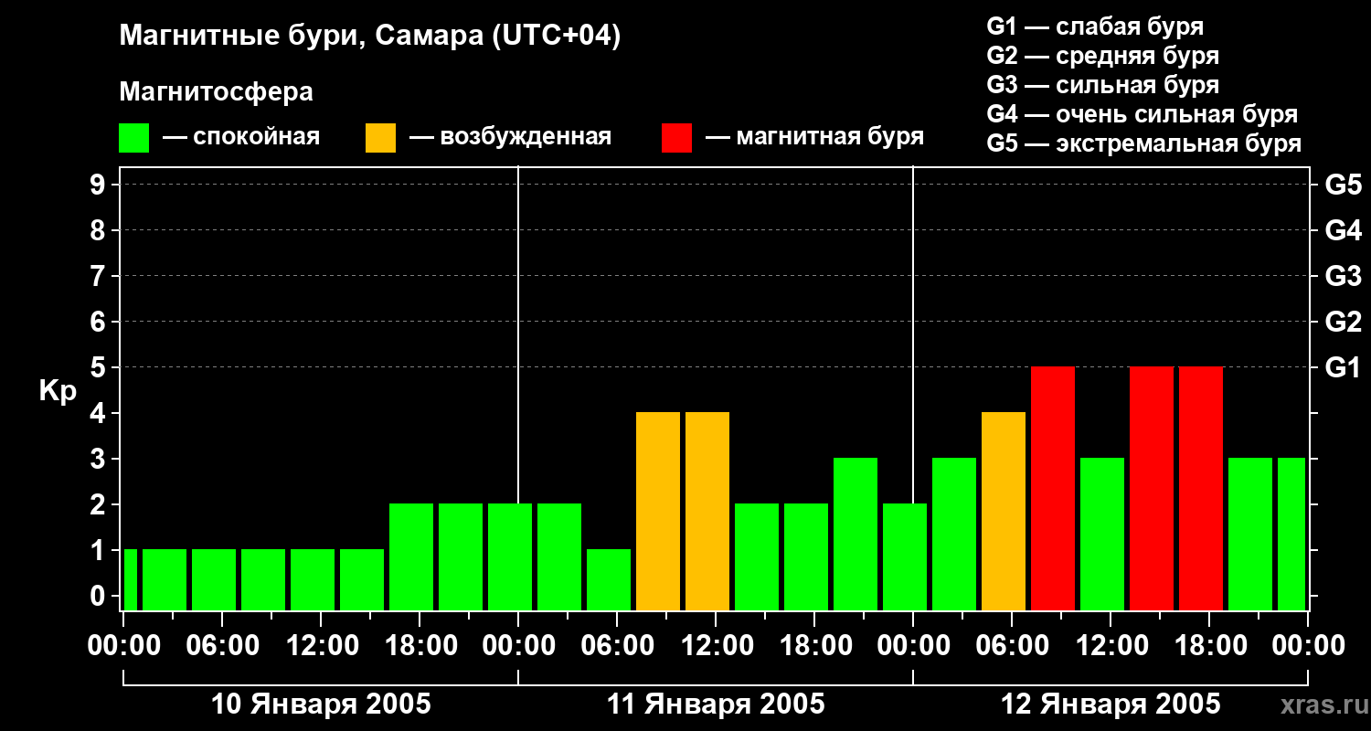 Изменения геомагнитного индекса Kp с 10 по 12 января 2005 года для средних широт