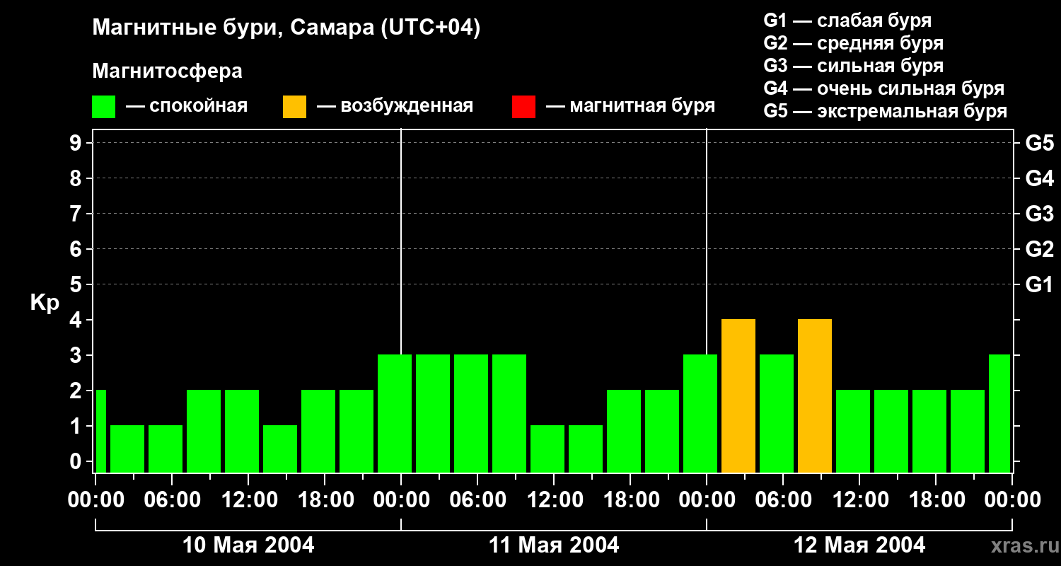 Изменения геомагнитного индекса Kp с 10 по 12 мая 2004 года для средних широт