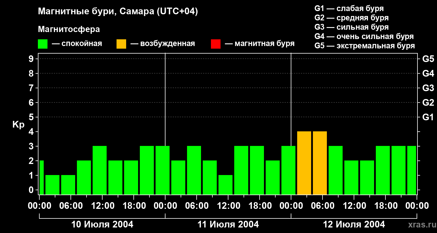 Изменения геомагнитного индекса Kp с 10 по 12 июля 2004 года для средних широт