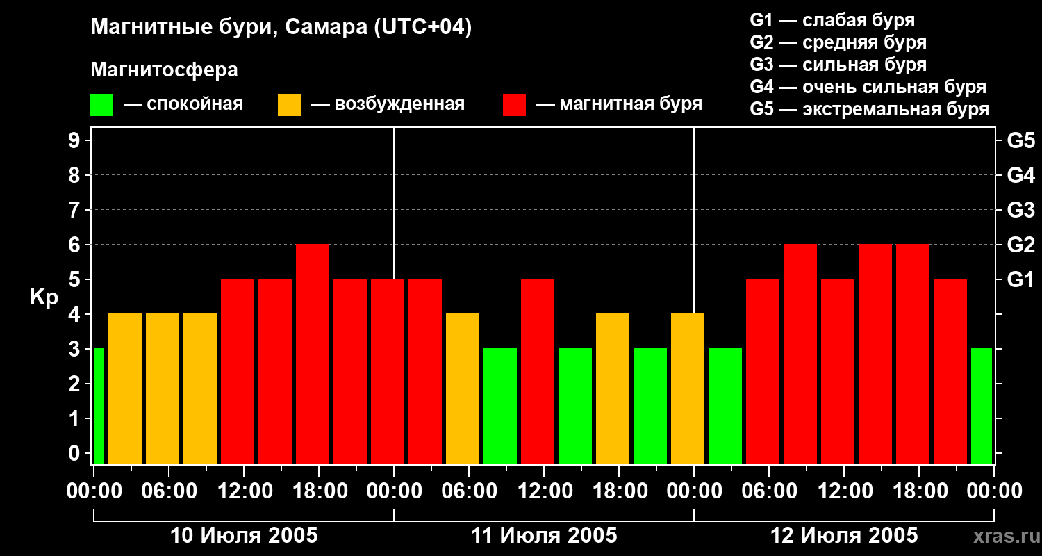 Изменения геомагнитного индекса Kp с 10 по 12 июля 2005 года для средних широт