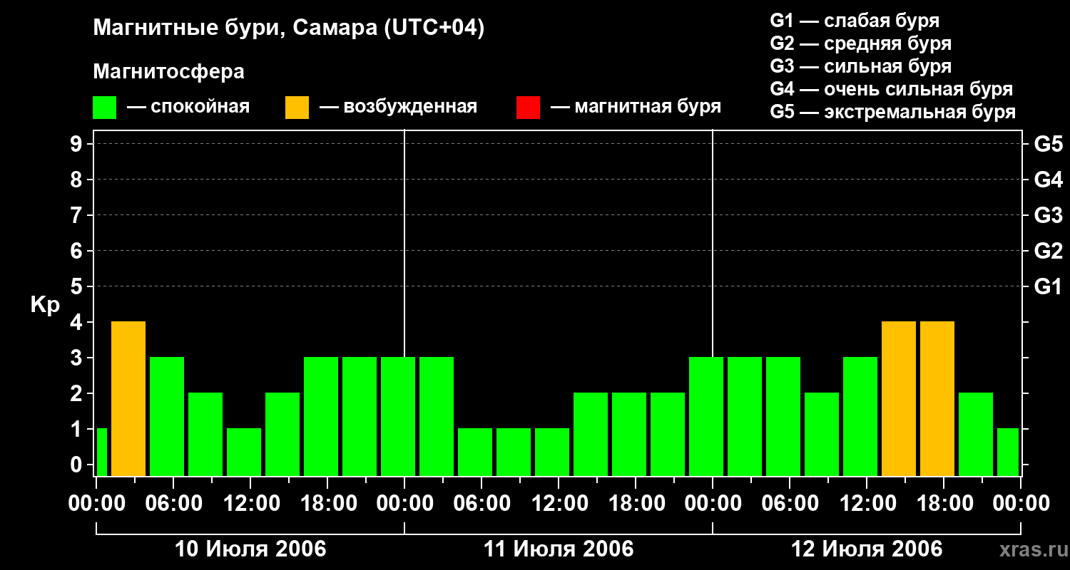 Изменения геомагнитного индекса Kp с 10 по 12 июля 2006 года для средних широт