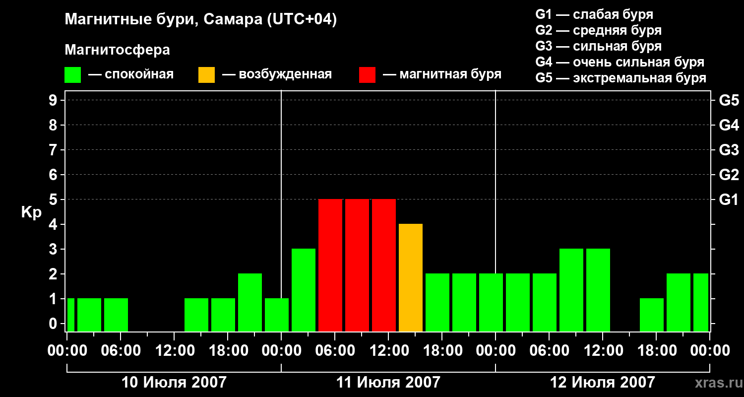 Изменения геомагнитного индекса Kp с 10 по 12 июля 2007 года для средних широт
