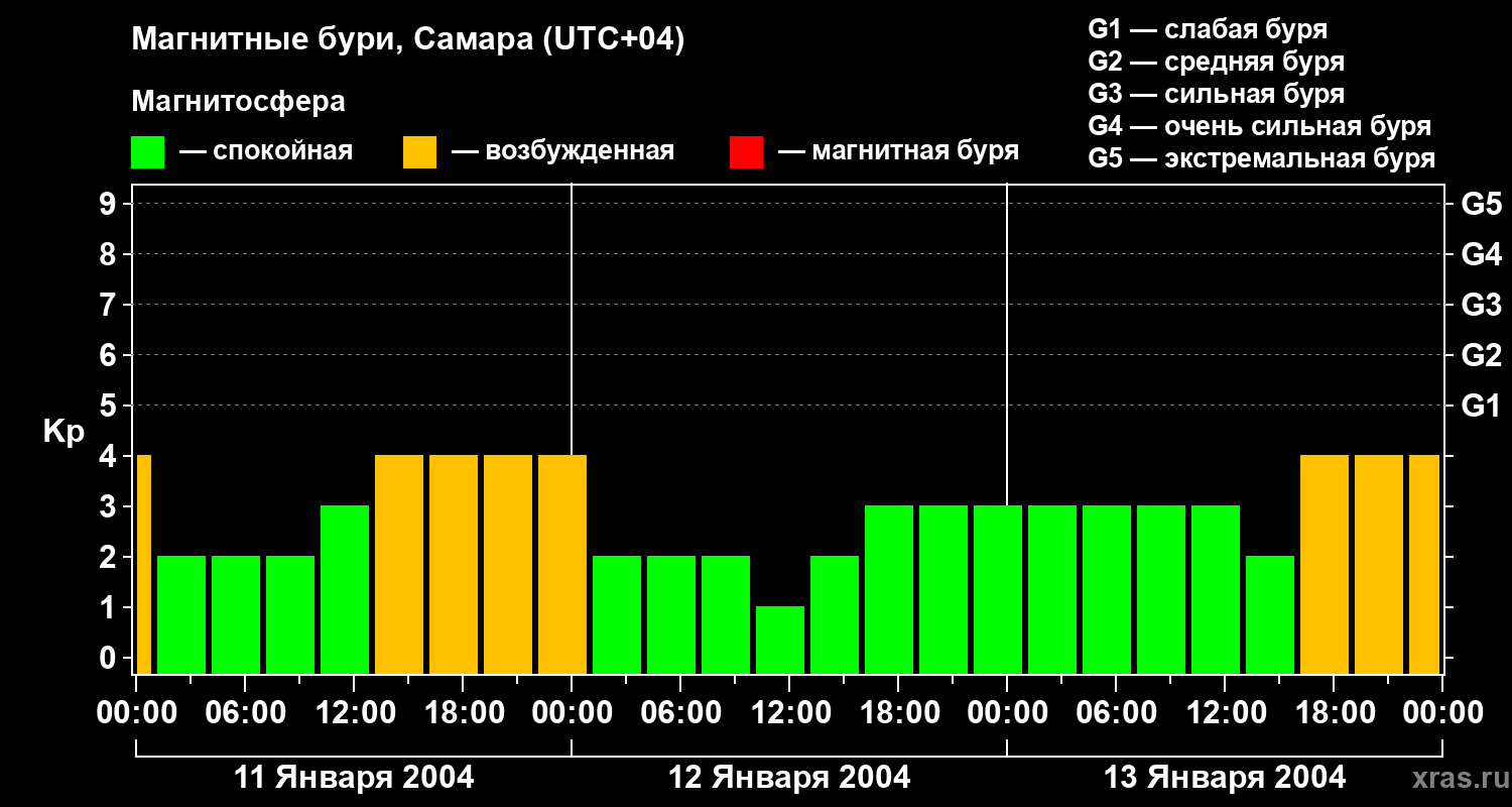 Изменения геомагнитного индекса Kp с 11 по 13 января 2004 года для средних широт