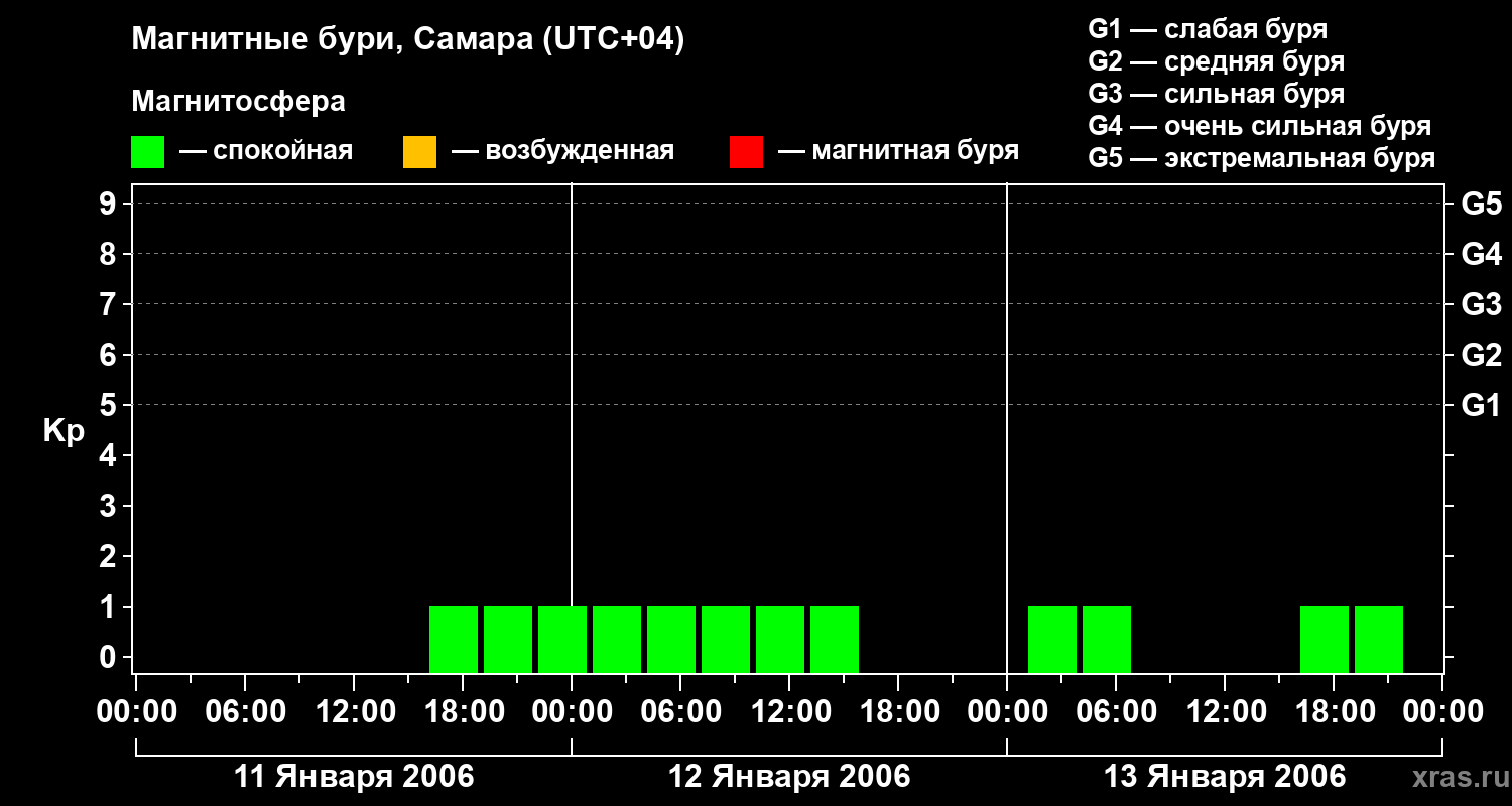 Изменения геомагнитного индекса Kp с 11 по 13 января 2006 года для средних широт