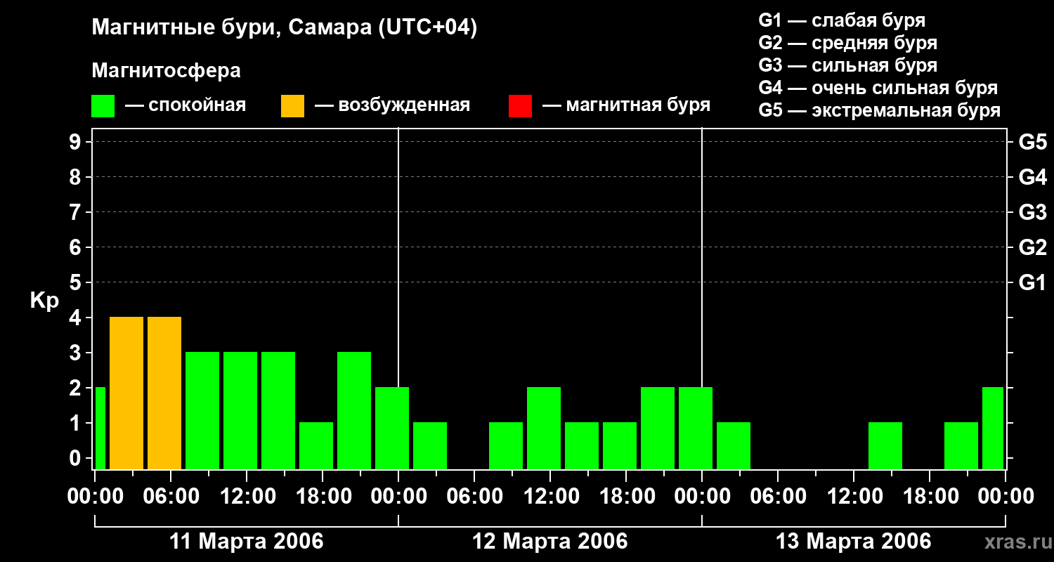 Изменения геомагнитного индекса Kp с 11 по 13 марта 2006 года для средних широт