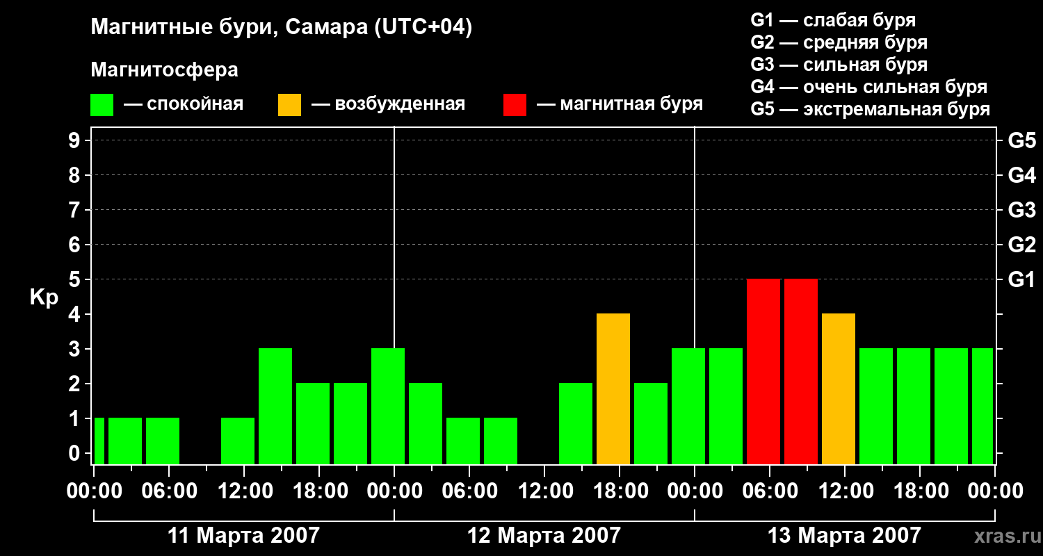 Изменения геомагнитного индекса Kp с 11 по 13 марта 2007 года для средних широт