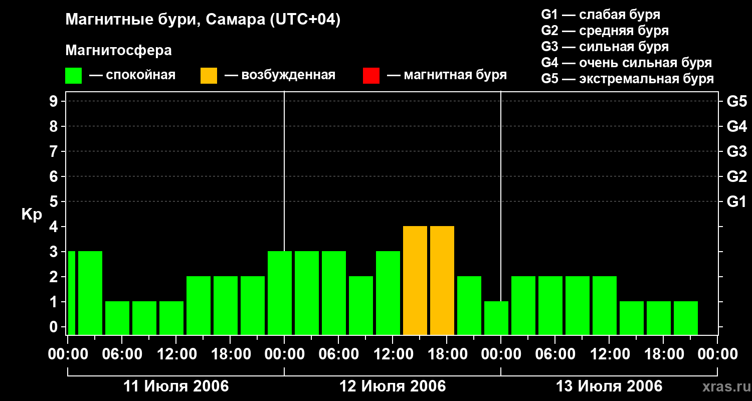 Изменения геомагнитного индекса Kp с 11 по 13 июля 2006 года для средних широт