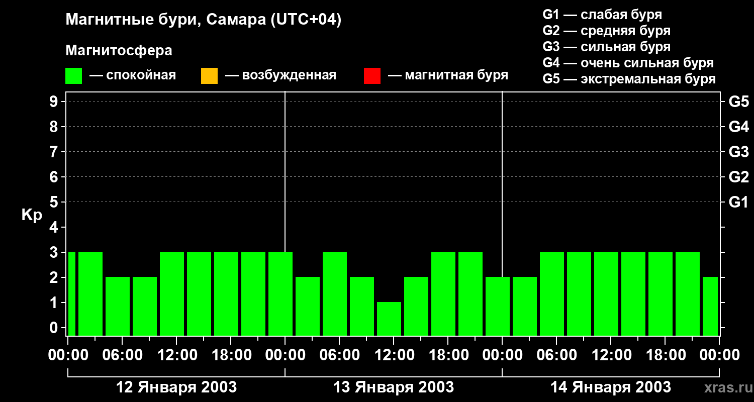 Изменения геомагнитного индекса Kp с 12 по 14 января 2003 года для средних широт
