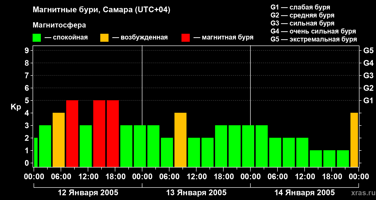 Изменения геомагнитного индекса Kp с 12 по 14 января 2005 года для средних широт
