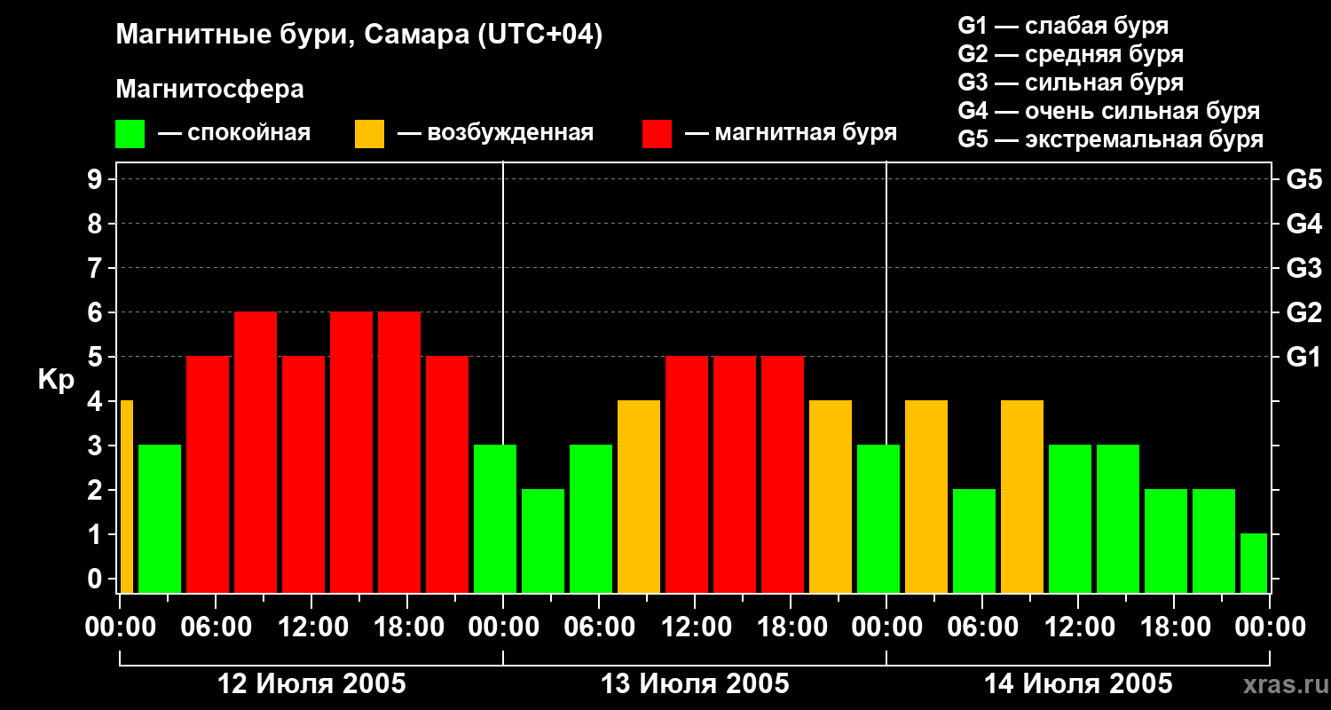 Изменения геомагнитного индекса Kp с 12 по 14 июля 2005 года для средних широт