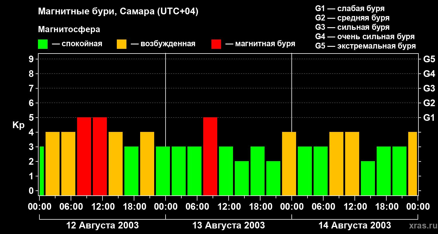Изменения геомагнитного индекса Kp с 12 по 14 августа 2003 года для средних широт