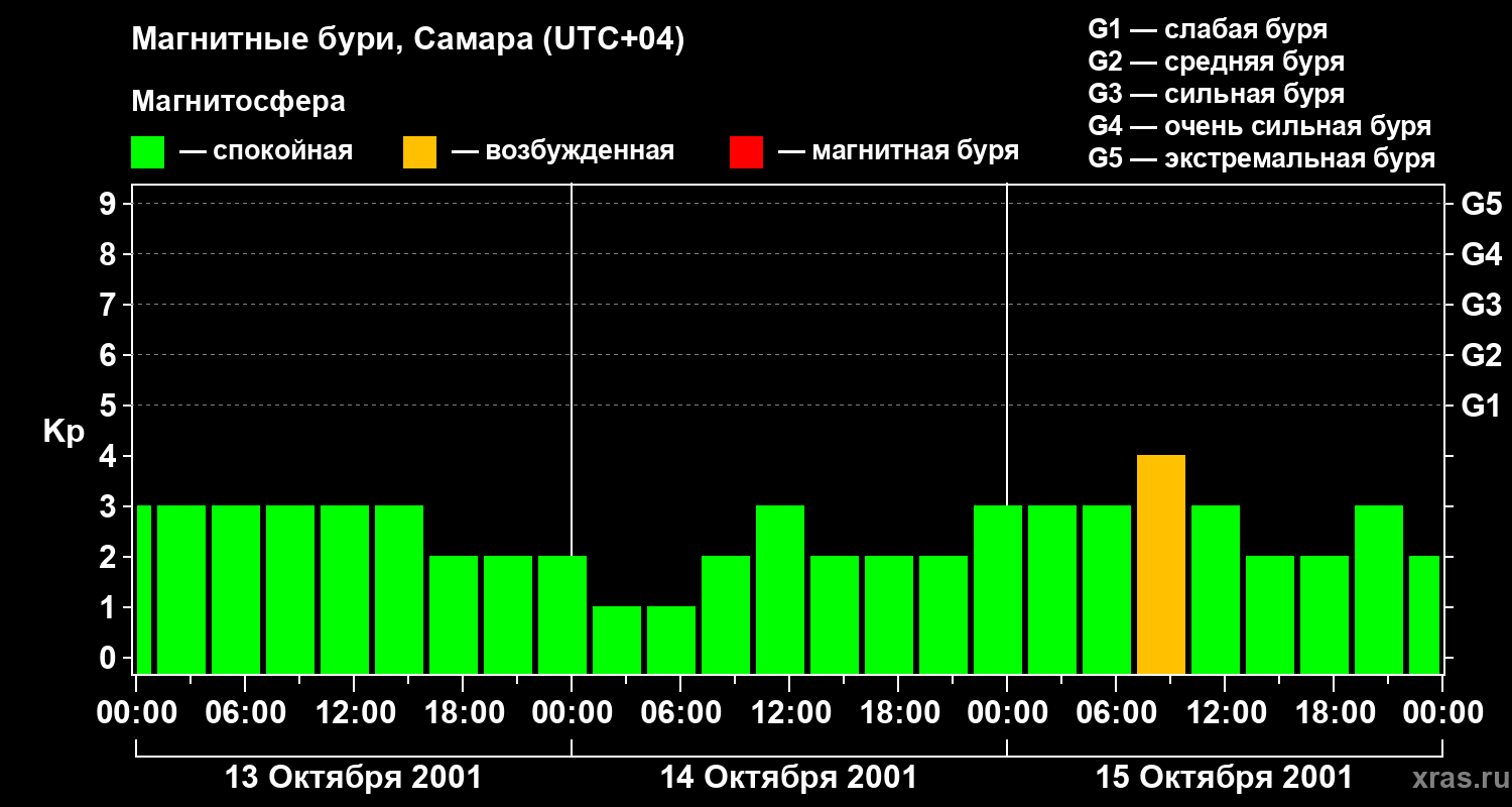 Изменения геомагнитного индекса Kp с 13 по 15 октября 2001 года для средних широт