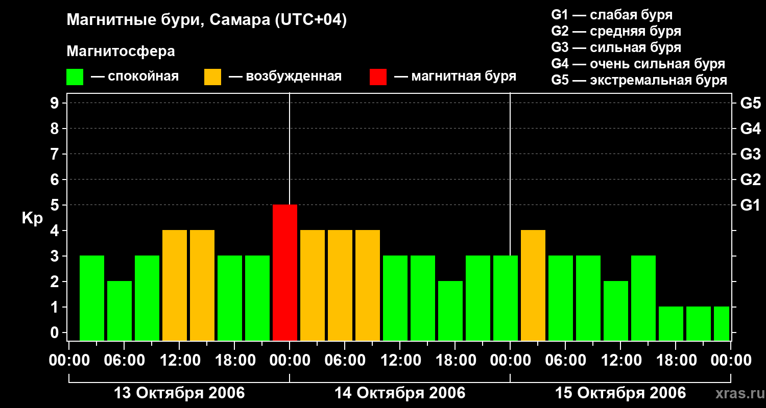 Изменения геомагнитного индекса Kp с 13 по 15 октября 2006 года для средних широт