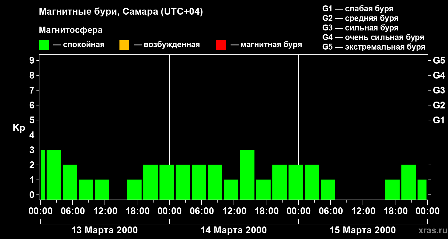 Изменения геомагнитного индекса Kp с 13 по 15 марта 2000 года для средних широт