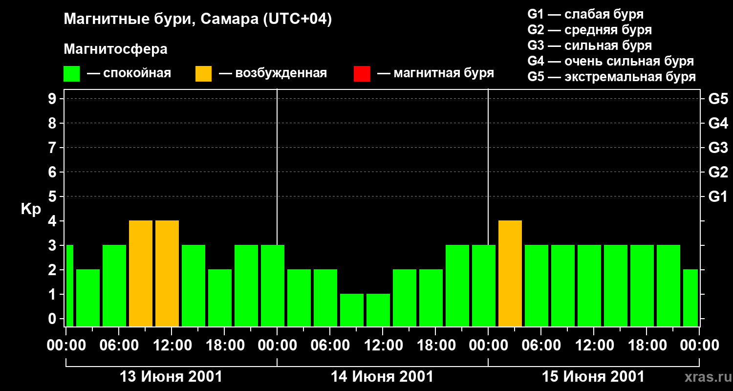 Изменения геомагнитного индекса Kp с 13 по 15 июня 2001 года для средних широт