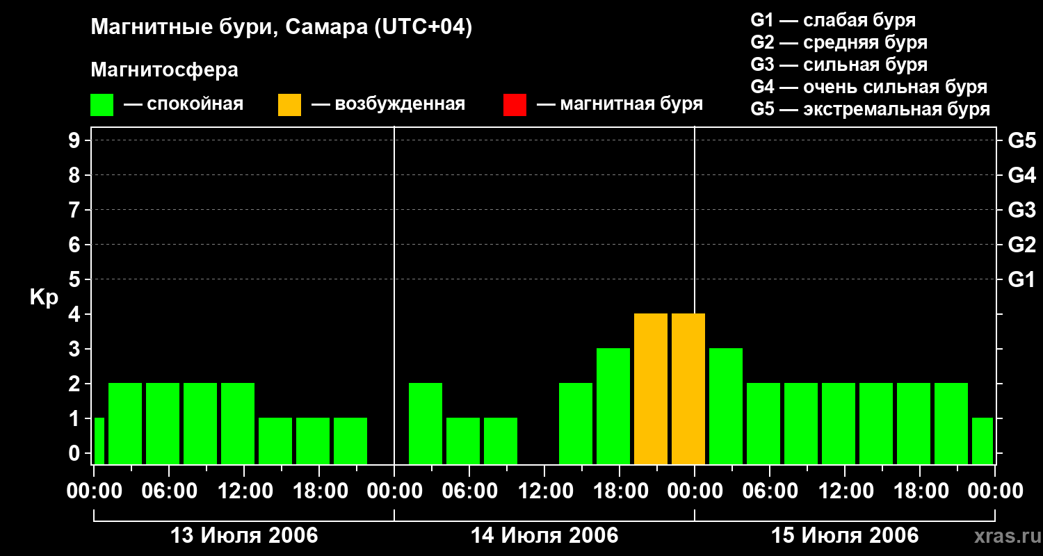 Изменения геомагнитного индекса Kp с 13 по 15 июля 2006 года для средних широт