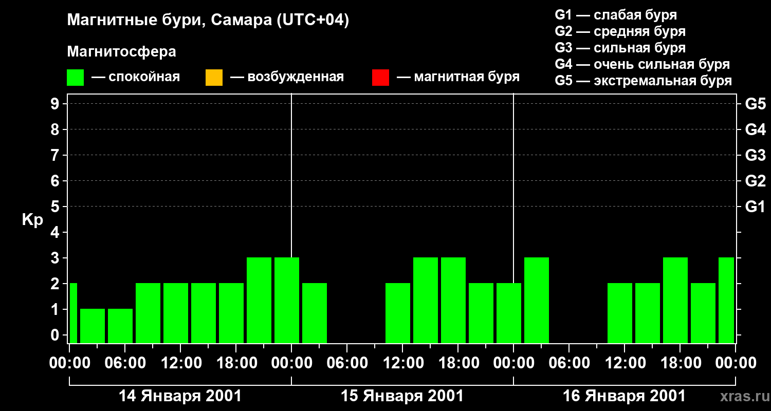 Изменения геомагнитного индекса Kp с 14 по 16 января 2001 года для средних широт